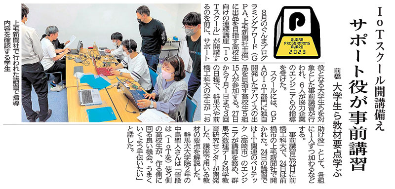 スクールには、GPAのIoT部門に独自開発したデバイスの出品を目指す高校生5組15人が参加する。27日から7月1日まで3回の日程で、群馬大や前橋工科大の学生が「お助け役」として、各組に1人ずつ加わるなどする。