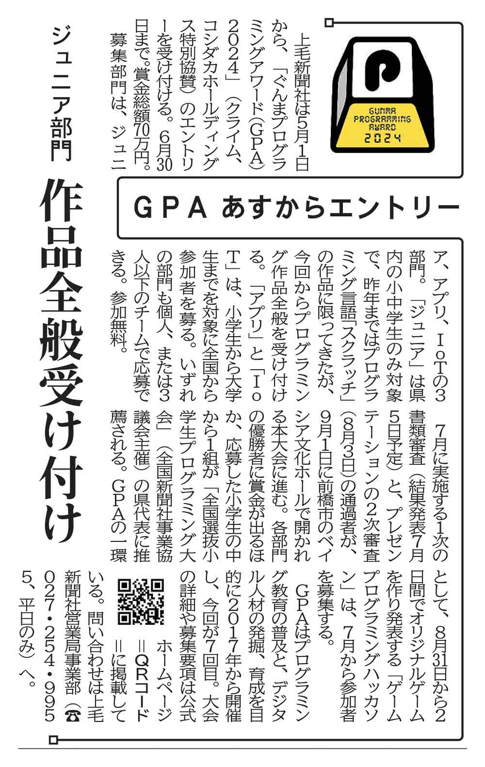 GPAはプログラミング教育の普及と、デジタル人材の発掘、育成を目的に2017年から開催し、今回が7回目。大会の詳細や募集要項は公式ホームページ=QRコード=に掲載している。問い合わせは上毛新聞社営業局事業部(☎027・254・9955、平日のみ)へ。