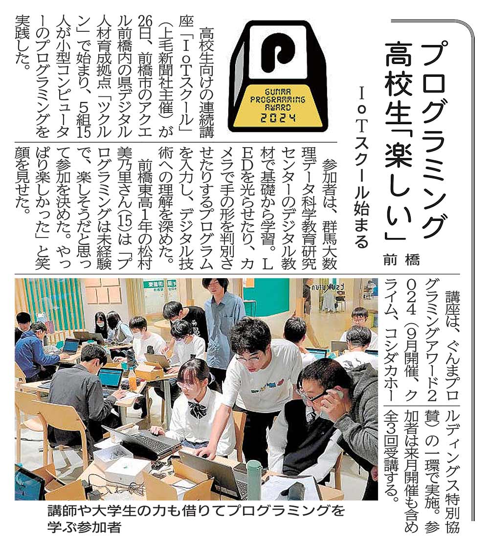 講座は、ぐんまプログラミングアワード2024(9月開催、クライム、コシダカホールディングス特別協賛)の一環で実施。参加者は来月開催も含め全3回受講する。
