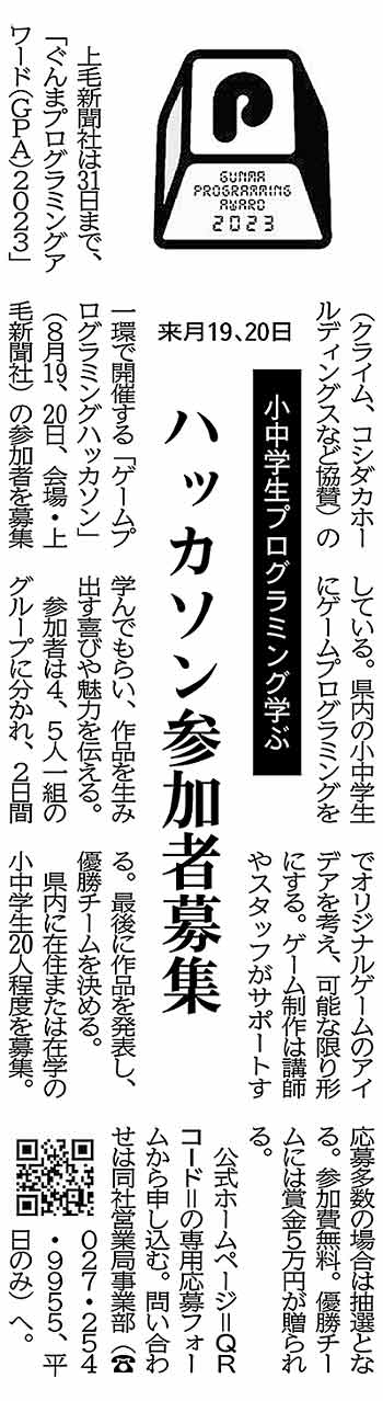 上毛新聞社は31日まで、「ぐんまプログラミングアワード(GPA)2023」(クライム、コシダカホールディングスなど協賛)の一環で開催する「ゲームプログラミングハッカソン」(8月19、20日、会場・上毛新聞社)の参加者を募集している。県内の小中学生にゲームプログラミングを学んでもらい、作品を生み出す喜びや魅力を伝える。