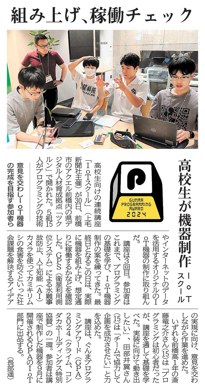 講座は、ぐんまプログラミングアワード(GPA)2024(クライム、コシダカホールディングス特別協賛)の一環。参加者は講座で制作した機器を9月に開催されるGPAのIoT部門に出品する。