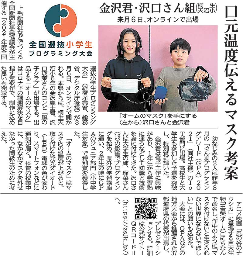 上毛新聞社などでつくる全国新聞社事業協議会が主催する「2021年度全国選抜小学生プログラミング大会」(経済産業省、総務省、デジタル庁後援)が3月6日、オンラインで開かれる。本県からは、桐生天沼小6年の金沢鷹士君、沢口瑛茉さんのコンビ「風の子クラブ」が出場する。出品する「オームのマスク」はコロナ下の課題解決を目指す意欲作で、制作に込めた思いも発表する。
