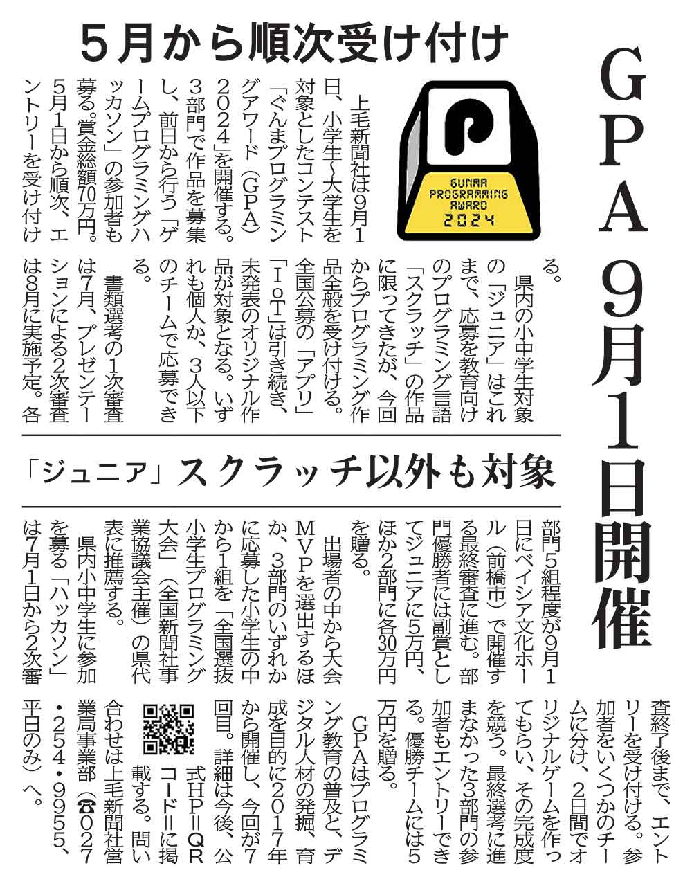 GPAはプログラミング教育の普及と、デジタル人材の発掘、育成を目的に2017年から開催し、今回が7回目。詳細は今後、公式HP=QRコード=に掲載する。問い合わせは上毛新聞社営業局事業部(☎027・254・9955、平日のみ)へ。