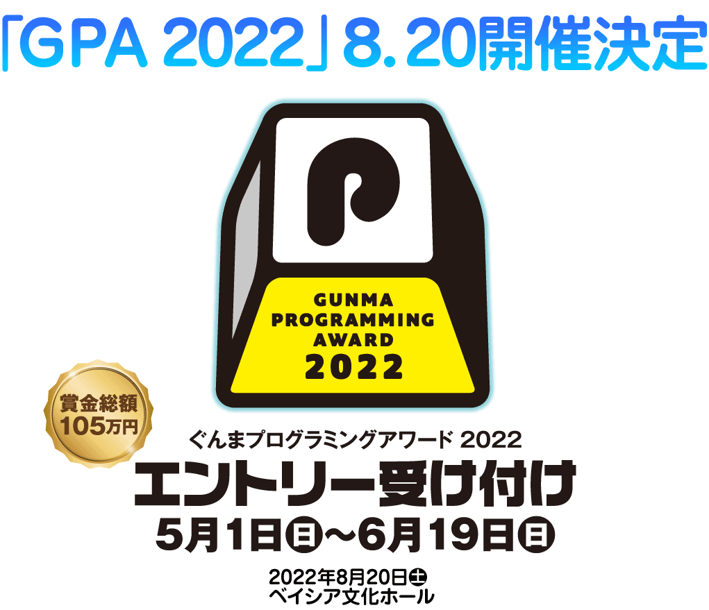 「ぐんまプログラミングアワード(GPA)2022」の開催が、8月20日(土)に決まりました。会場は前橋市のベイシア文化ホールです。トップページに募集要項を掲載しています。