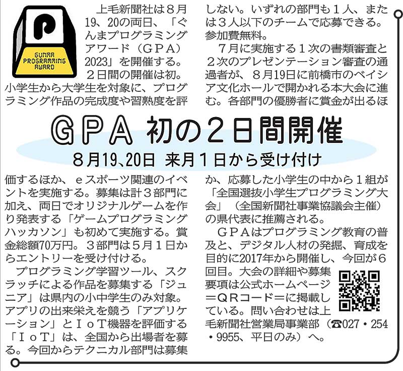 GPAはプログラミング教育の普及と、デジタル人材の発掘、育成を目的に2017年から開催し、今回が6回目。大会の詳細や募集要項は公式ホームページ=QRコード=に掲載している。問い合わせは上毛新聞社営業局事業部(☎027・254・9955、平日のみ)へ。